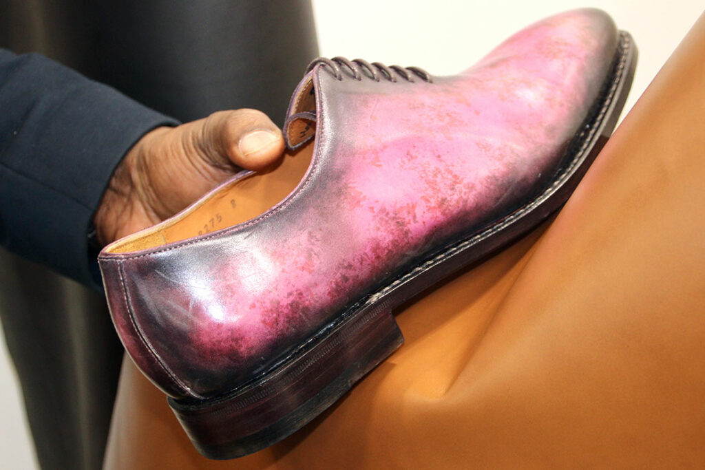 展示されたボックスカーフは、ハリがあり光沢感に溢れる。この高級皮革から、プレミアムな靴やブーツが生み出されている。