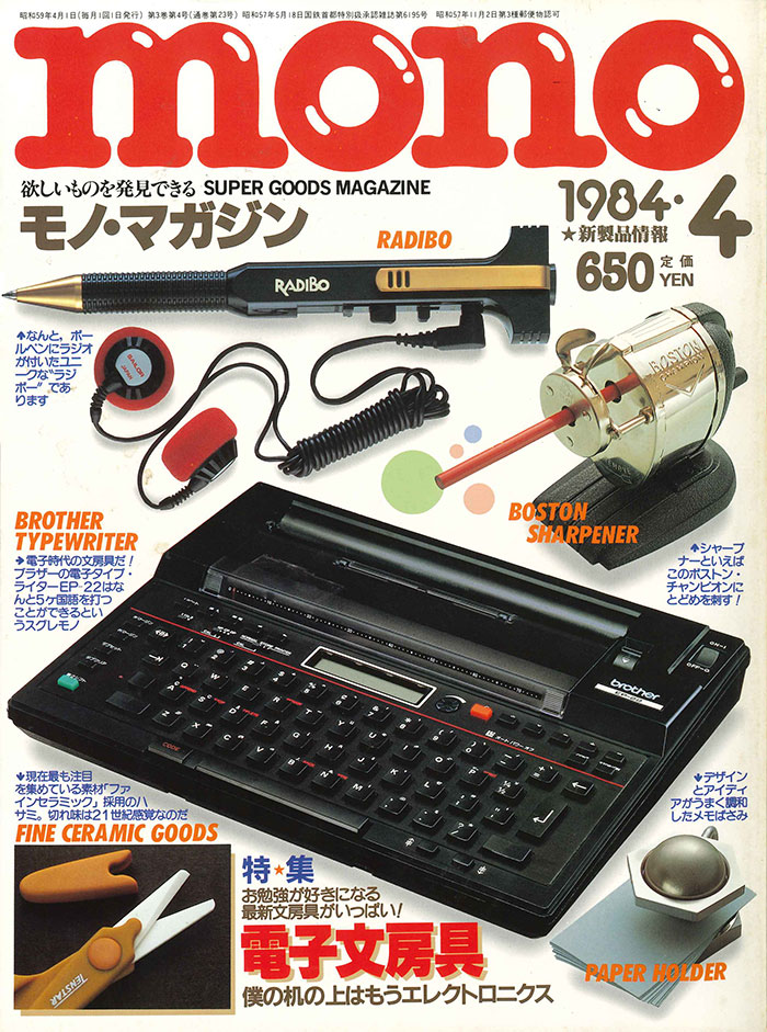 ハイ、これが22号の表紙です。この号では、特集「電子文房」で紹介しているブラザー工業の電子タイプライター「EP-22」。日本語、英語、ドイツ語、スペイン語とあともう1ヵ国語(そこまで書いてませんでした)の5ヵ国語で入力できるんだそうです。ただし、ディスプレイは16文字表示。今となっては、どうやって使っていいのかわからないという人の方が圧倒的多数でしょう。