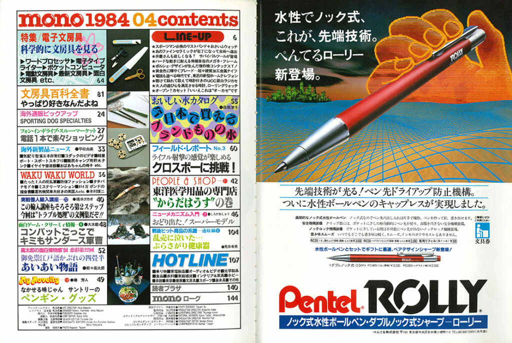目次です。右ページの広告は、ぺんてるの「ROLLY」。映画『トロン』を彷彿とさせるイラストでの先端技術表現が味わい深いです。