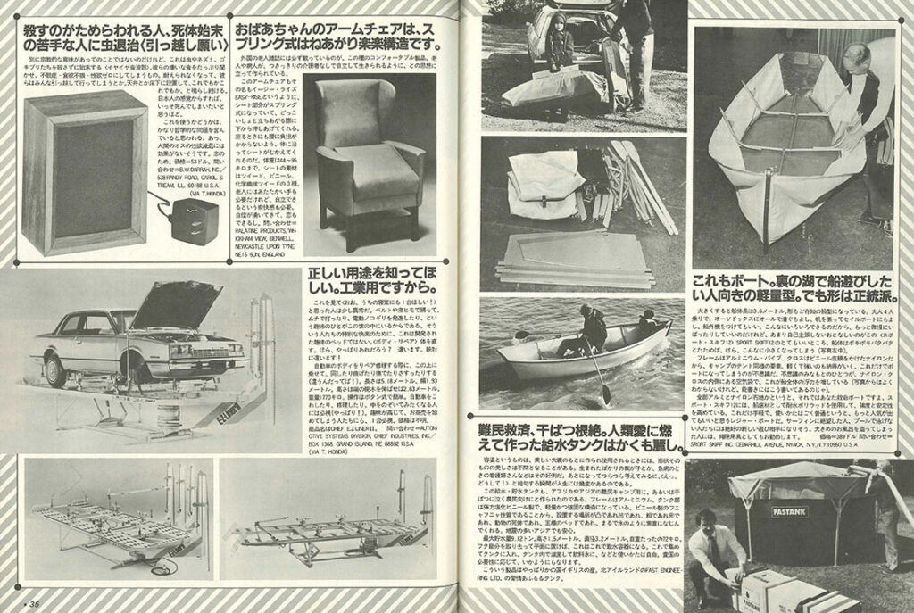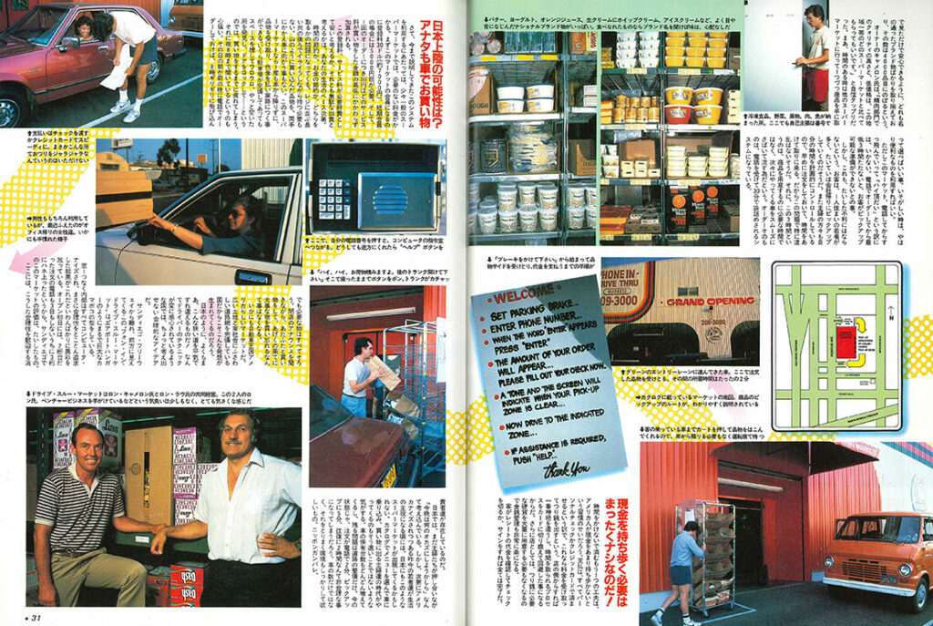 カラー5ページの「クルマに乗ってショッピング。サンディエゴのドライブ・スルー・マーケット」。バーガーショップなんかにあるドライブスルーのスーパーマーケット版のレポートです。当時は「さっすが、アメリカ進んでる〜」って感じだったんだと思います。