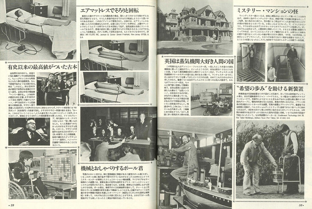 「WAKU WAKU WORLD ビックリするような珍発明」でムムムッと思ったのは「ミステリー・マンションの怪」という記事。「ウィンチェスター銃といえば、鉄砲に興味のないひとだって聞いたことはあるはず。1894年に当のウィンチェスター氏は、鉄砲で稼いだ巨額の財産をのこしてご他界。独り残された未亡人、気の毒にもご亭主がつくった銃で殺された人びとの恨みが彼女をとりまいている、と信じこむようになった。で、どうしたかというと、サラおばさんはまずコネチカットからカリフォルニアへと転居した。が、それでも心は休まらず、心霊術師に相談したところ、さまよえる霊魂に部屋をつくってやれば、ということになってさっそく増築がはじまり、以来なんと36年もの間サラ邸ではトンテンカンの音が鳴りひびき13階段、13の窓、13の天井板、13本のシャンデリヤといった、そのつどお告げどおりに奇妙な部屋をつけたして、とうとう160室になったところで、1928年サラおばさんもやっと休眠で一件落着。」。すこしオカルティックなような、全然そうでもないようなニュースでした。
