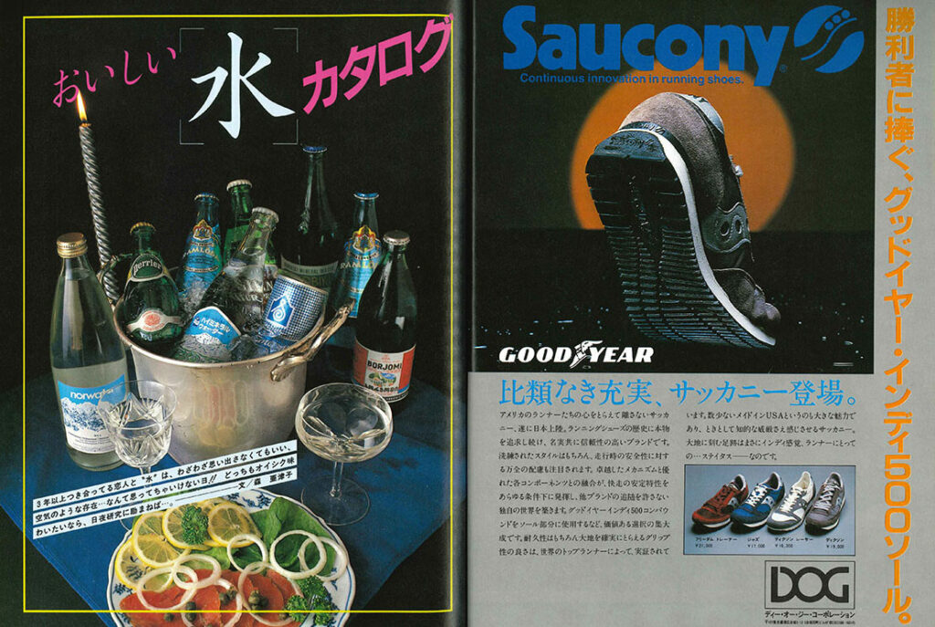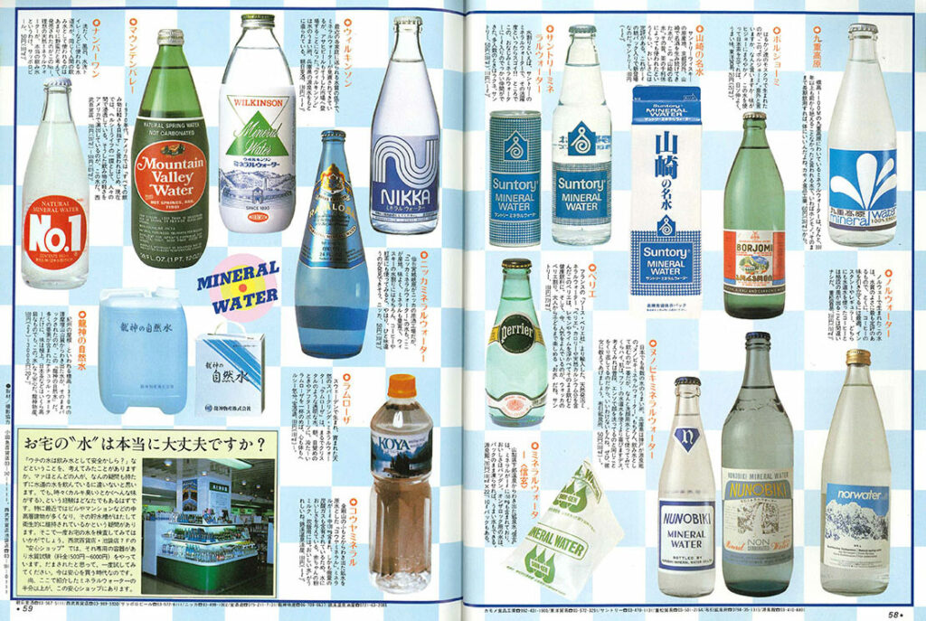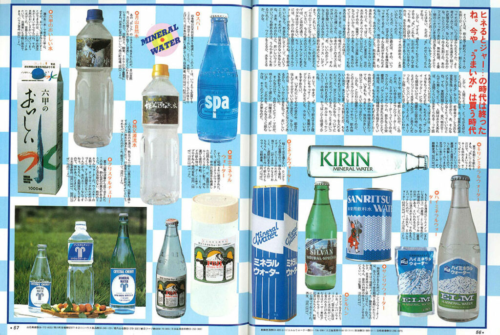 カラー5ページ構成の「おいしい水カタログ」。いまとなってはそんなこと思わないんですが、昔は自販機で水を買うという行為に納得できなかったワケです。蛇口ひねれば飲める水をなんだって金出して・・・と貧乏な家に生まれた若き編集者は考えてたんですね。
