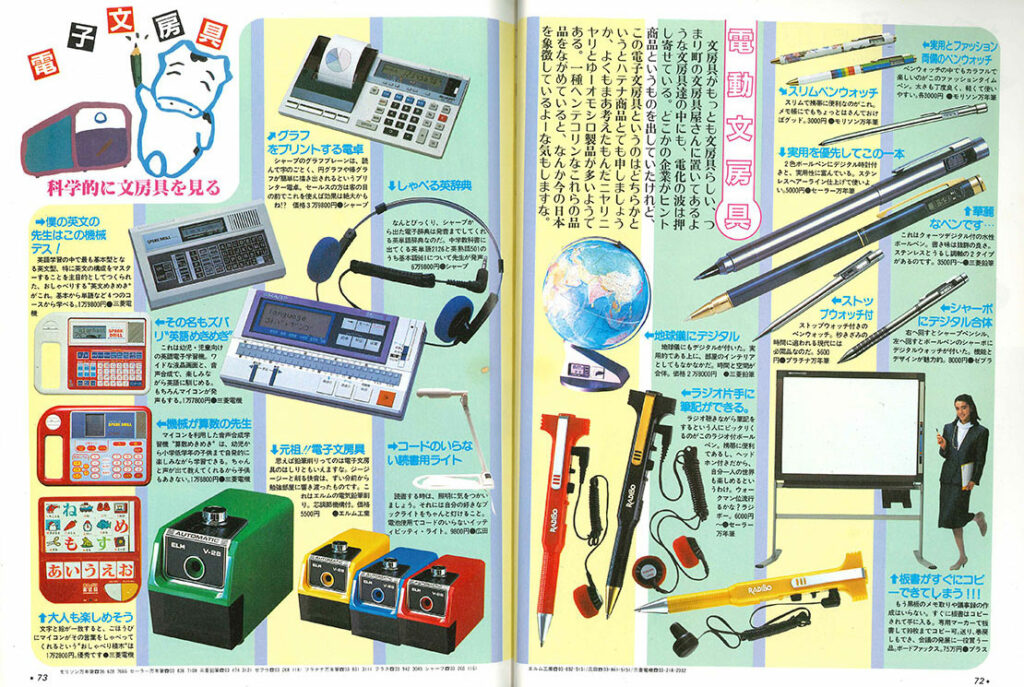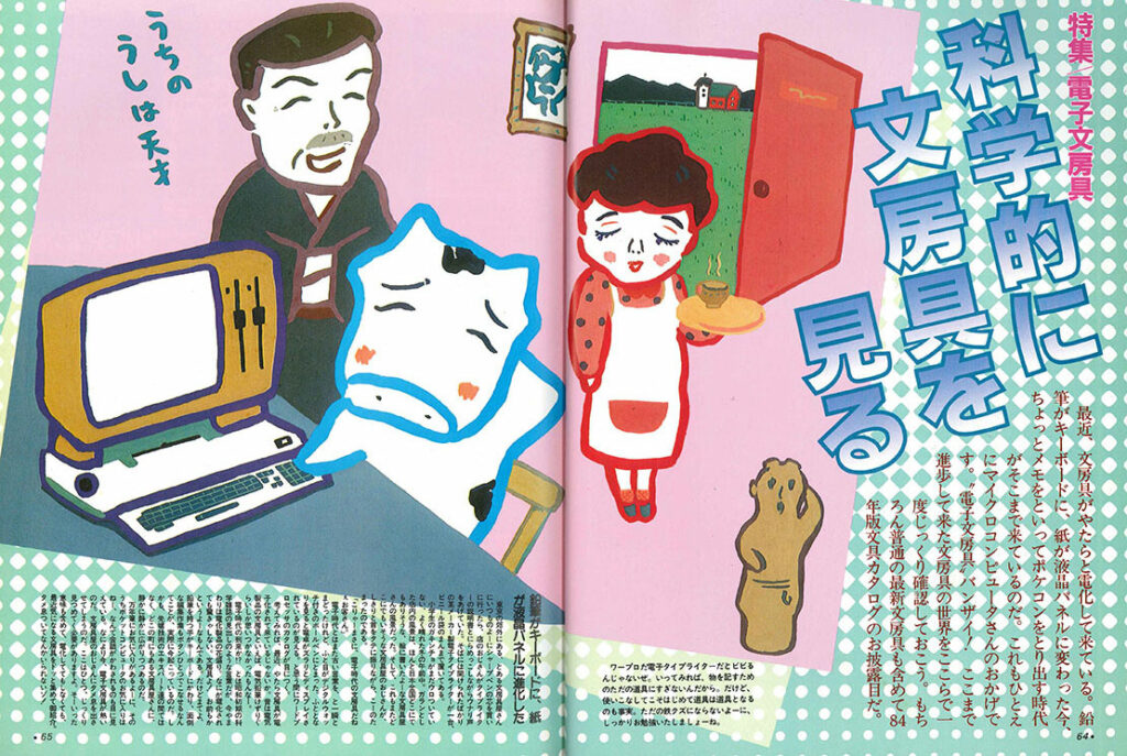 そして、「特集 電子文房具 科学的に文房具を見る」。カラー16ページ。前半で電子文房具、後半で当時最新の普通の文房具を紹介してます。メインビジュアルを18号(https://www.monomagazine.com/103295)でも「Dairyman’s Catalog 牛もので決める!」とうい不思議なグッズ企画でイラストを描いてくださっていたみうらじゅん先生が担当。『単になんぎなうし』とか、『学園ハニワもの「ハニーに首ったけ」』とか、なつかしい・・・。ちなみにみうら先生の『ガロ』デビュー作は「ウシの日」だそうです。