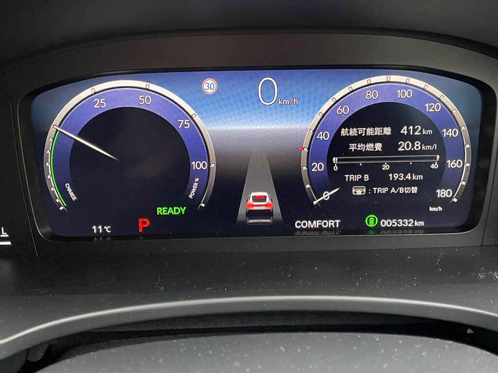 回生ブレーキやエンジンによる充電が早めにバッテリーに溜まる印象で、街中で流れに乗っている範囲では燃費の悪化はあまり感じなかった。