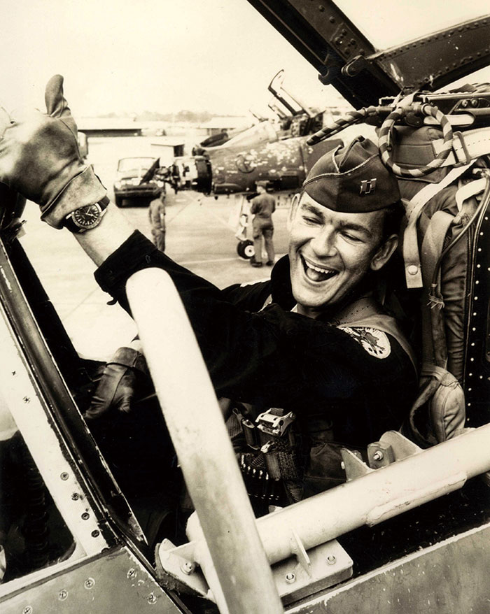 ※写真は1967年11月、北ベトナムの爆撃のミッションを終えたE. コーカ大尉。タイ・ウボン基地で100回達成のポーズを決めた彼の左腕にはグリシンが輝いていた。Photo/USAF