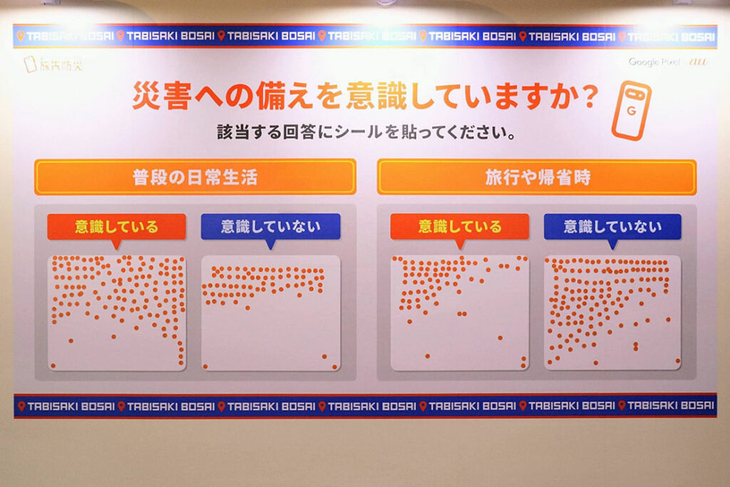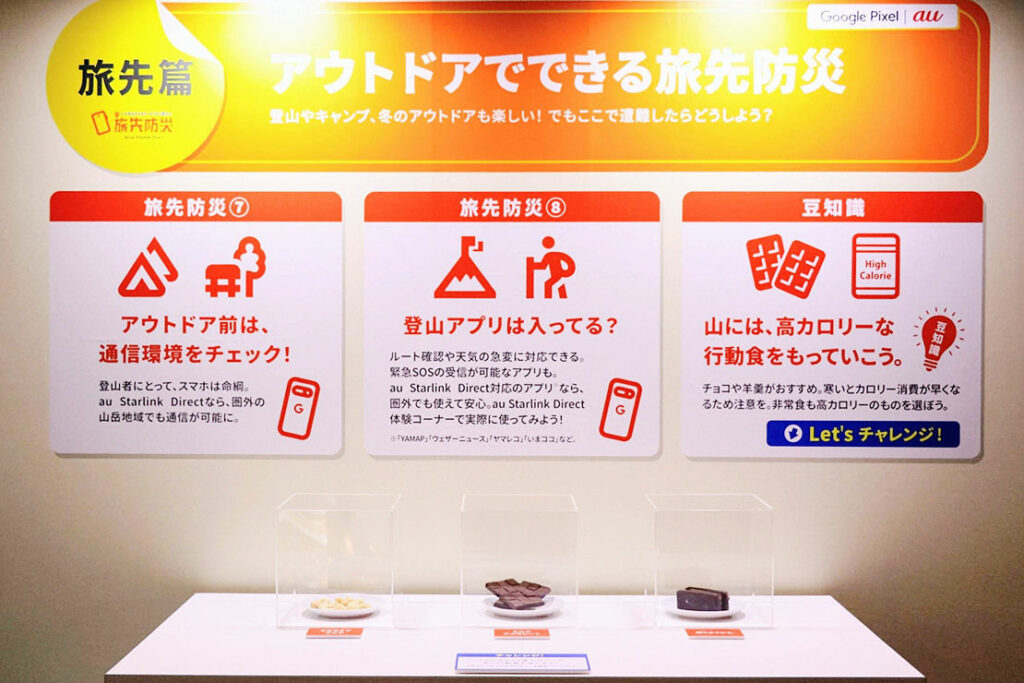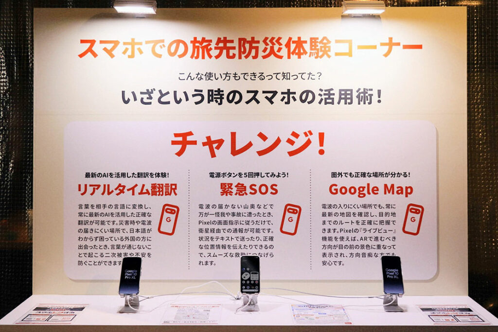 Googleの最新機種「Google Pixel10」を用いて圏外でも「au Starlink Direct」のデモ体験ができるなど、『旅先防災』をさまざまなかたちで体験できたぞ。