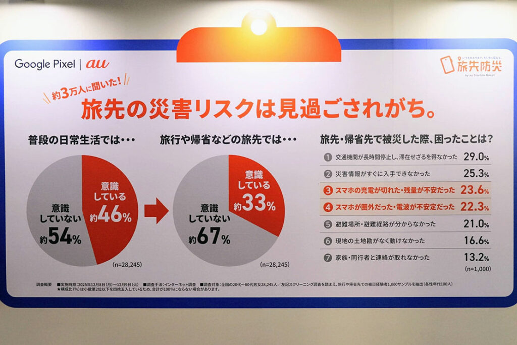 Google Pixel 10 シリーズ × au Starlink Direct が「旅先防災」に強い理由は、“圏外でもつながる通信” と “災害時に役立つスマホ機能” を、1台のいつものスマホで完結できる点だ。旅先で多い「圏外」「充電不安」「情報不足」という課題を、KDDI が実施した大規模調査やイベントで明確にし、それを Pixel 10 と Starlink Direct が実際に補完している。