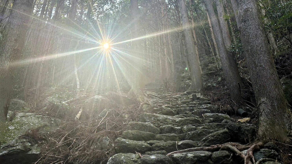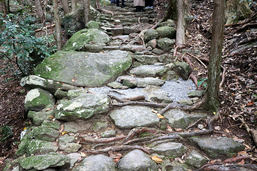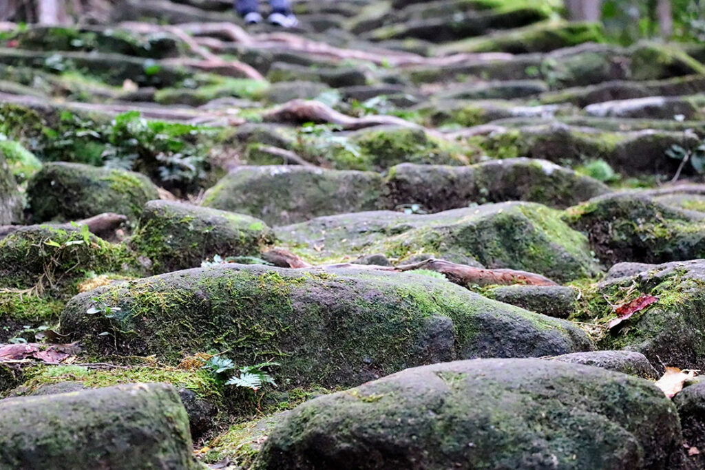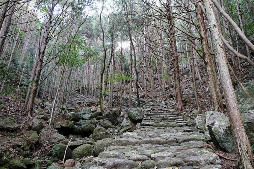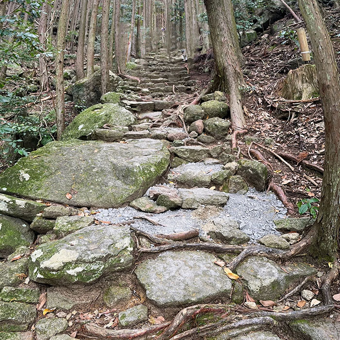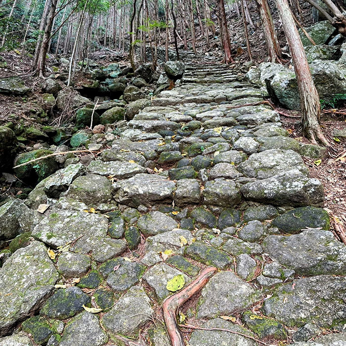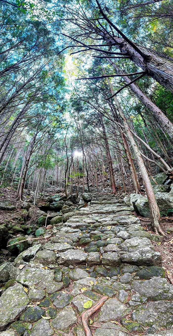 木々が音を吸い込み、足音だけが際立つ。峠道らしい “静けさの密度” が濃い。歴史ある石畳は、見る価値も歩く価値もある世界遺産だ。雨の多い紀伊地方らしく、石にはきれいな苔が生えている。
