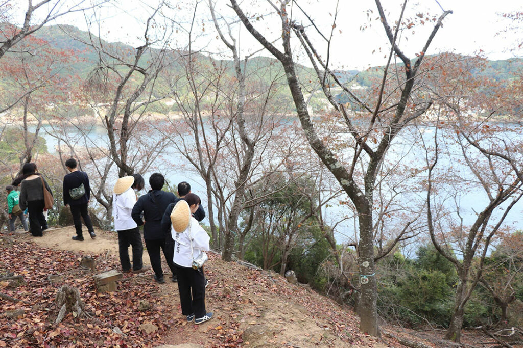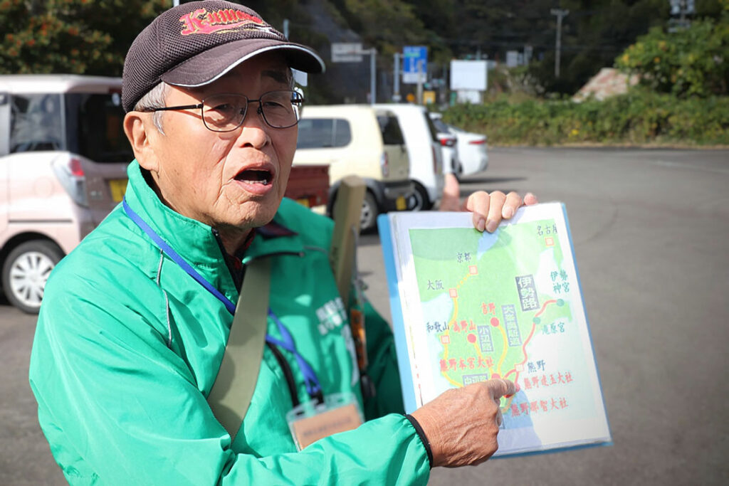 松本峠は、伊勢参りを終えて熊野三山へ向かう「伊勢路」における最後の峠である。この峠を越えると、参詣者は一転して平坦な七里御浜の道を歩くことになる。平安中期以降、紀伊半島南部に位置する熊野三山(熊野本宮大社・熊野速玉大社・熊野那智大社)への信仰が広まり、その参詣道として多くの人々がこの地を行き交った。上皇など身分の高い人々が利用した「紀伊路」に対し、三重県側を通る「伊勢路」は、江戸時代になると伊勢参りを終えた庶民が熊野三山へ向かうための参詣道として広く利用されていた。地元語り部の「西山さん」からレクチャーを受け、いよいよ松本峠へ。
