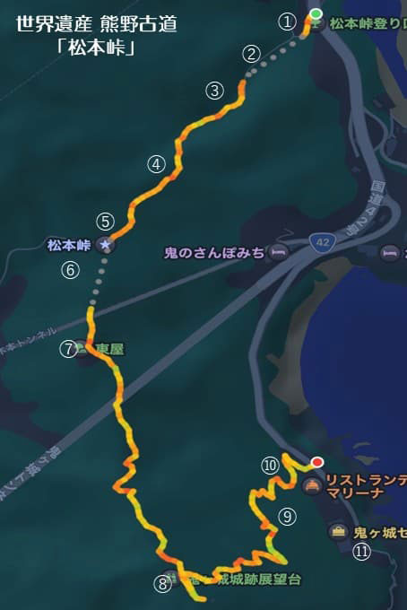 松本峠を越え、目的地の鬼ヶ城まで約5.5km。所要時間は約2時間半ほどの行程だ。今回は、GPSで実際に歩いた軌跡を地図に落とし込んでみた。体感では「あっという間に走破した」という印象だったが、地図で見ると実際にはかなり広い範囲を移動していたことがわかる。松本峠の様子や風景の変化が伝わるよう、道中のポイントには番号を振って整理してみたぞ。