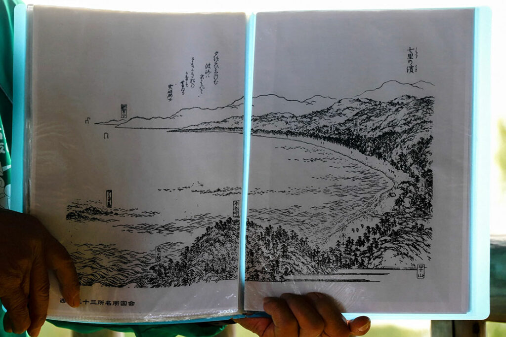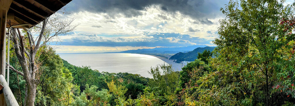 東屋は、七里御浜を最も美しく眺められる “伊勢路随一の絶景ポイント” だ。苔むした石畳を抜け、竹林を渡る風が心地よい峠道の途中に現れる小さな東屋からは、熊野速玉大社のある新宮まで約25km続く七里御浜の海岸線を一望できる。江戸時代に刊行された『西国三十三所名所図会』に描かれた「七里の濱」と変わらぬ景観が、今もそこに広がる。ゆるやかな弧を描く海岸線と熊野灘の青が重なり、熊野古道の中でも屈指の眺望を誇る場所だ。