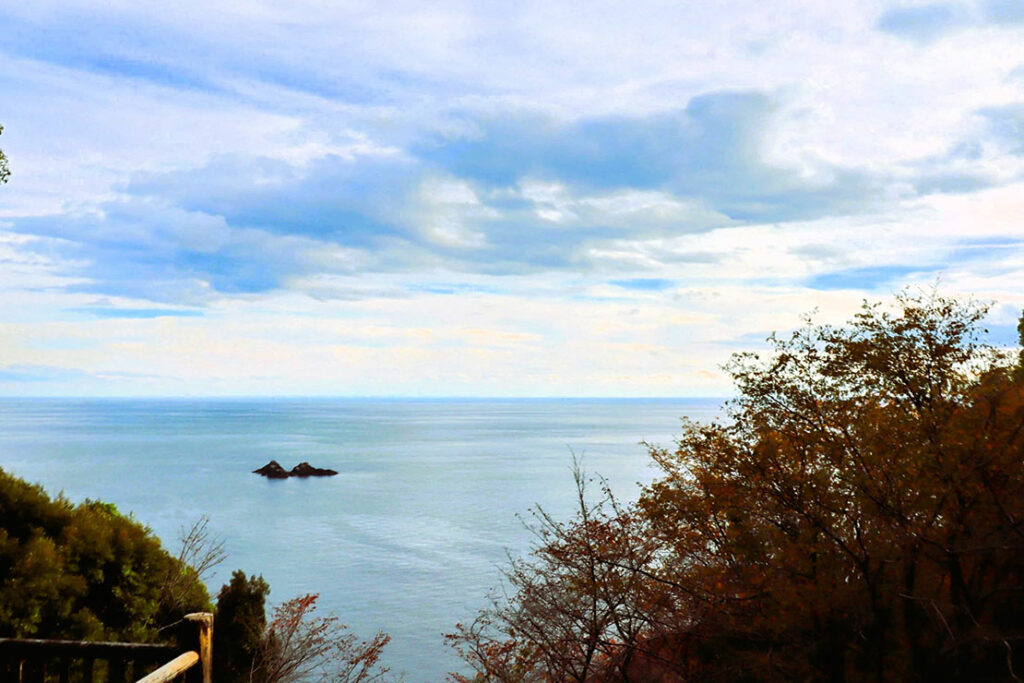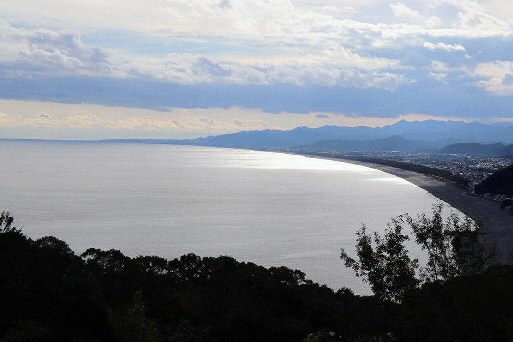 東側の七里御浜に目を奪われがちだが、西側には小さな湾が広がっている。熊野古道伊勢路の険しい最終峠を望むことができる、隠れた絶景ポイントだ。