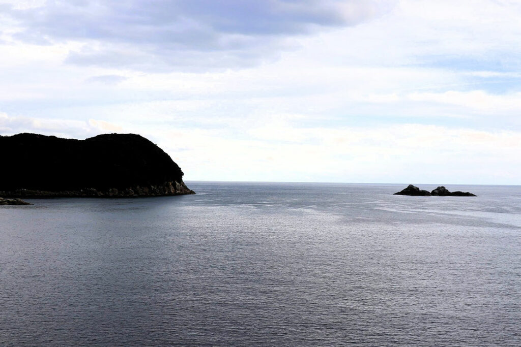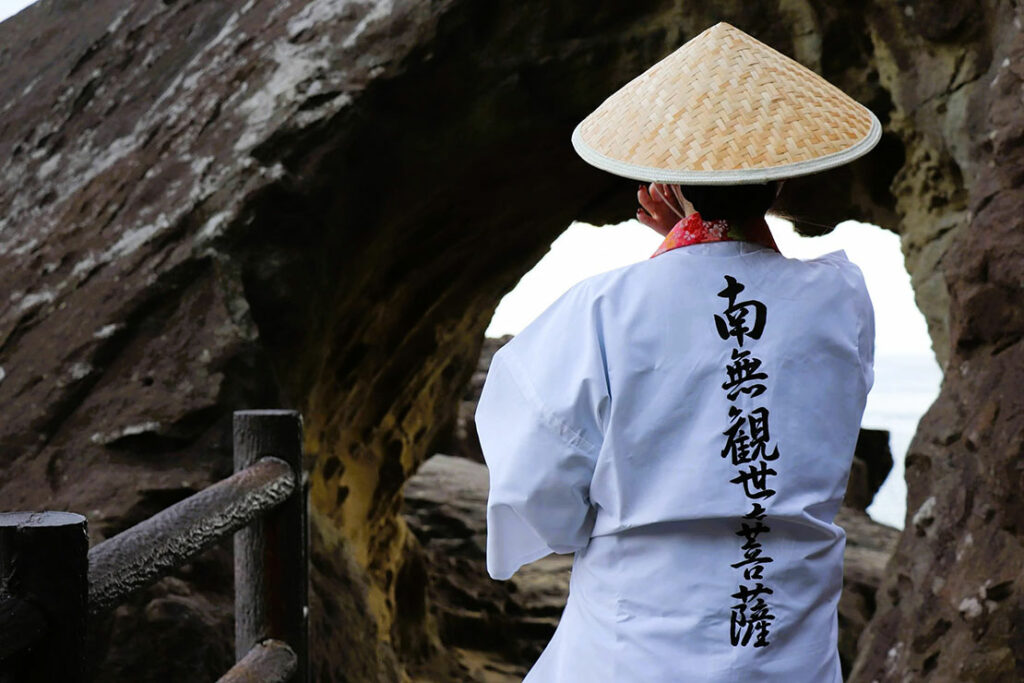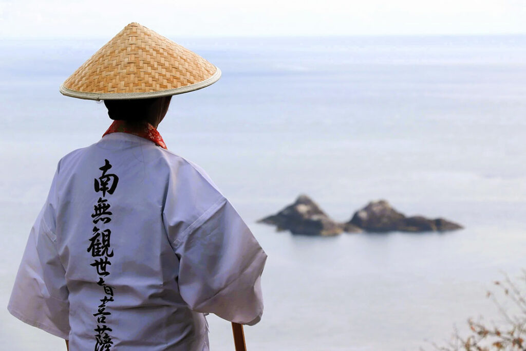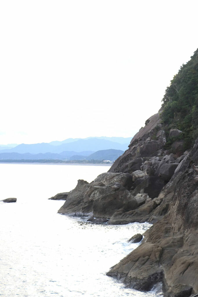 波の高さ、風の向き、光の角度が変わるたび、同じ岩がまったく異なる表情を見せる。写真には収まりきれない、身体で浴びる、動き続ける景観だ。熊野灘を見ながら何を考える巡礼者。