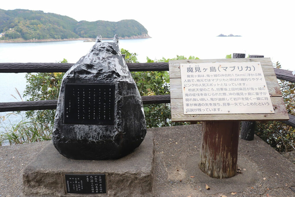 鬼ヶ城に入ってまず目に飛び込んでくるのが、「魔見ヶ島(まみるがしま/マブリカ)」だ。熊野灘に浮かぶ小さな無人島で、坂上田村麻呂の鬼退治伝説と深く結びついた “熊野の神話的スポット” として知られている。時代は桓武天皇の頃(8〜9世紀)。熊野の海を荒らしていた鬼(海賊)を討伐しようとした田村麻呂の前に、沖合の魔見ヶ島で童子が現れ、舞い唄って将軍を導いたと伝わる。鬼の大将が油断して岩屋の戸を開けた瞬間、田村麻呂が矢を放ち、見事に討ち取ったという。このとき童子が姿を現した島として、「魔を見るか」から転じて「魔見ヶ島」と呼ばれるようになったとされる。