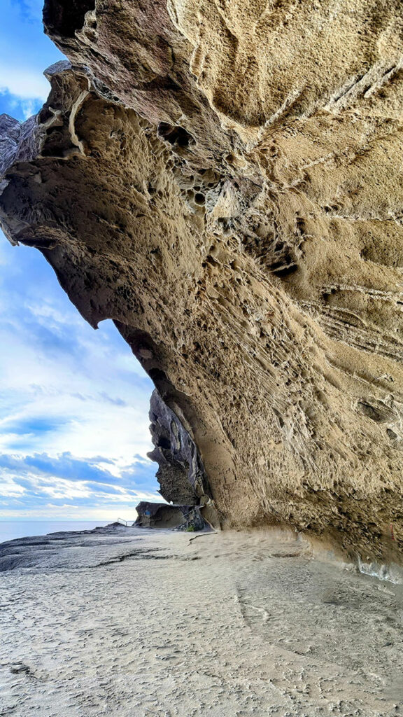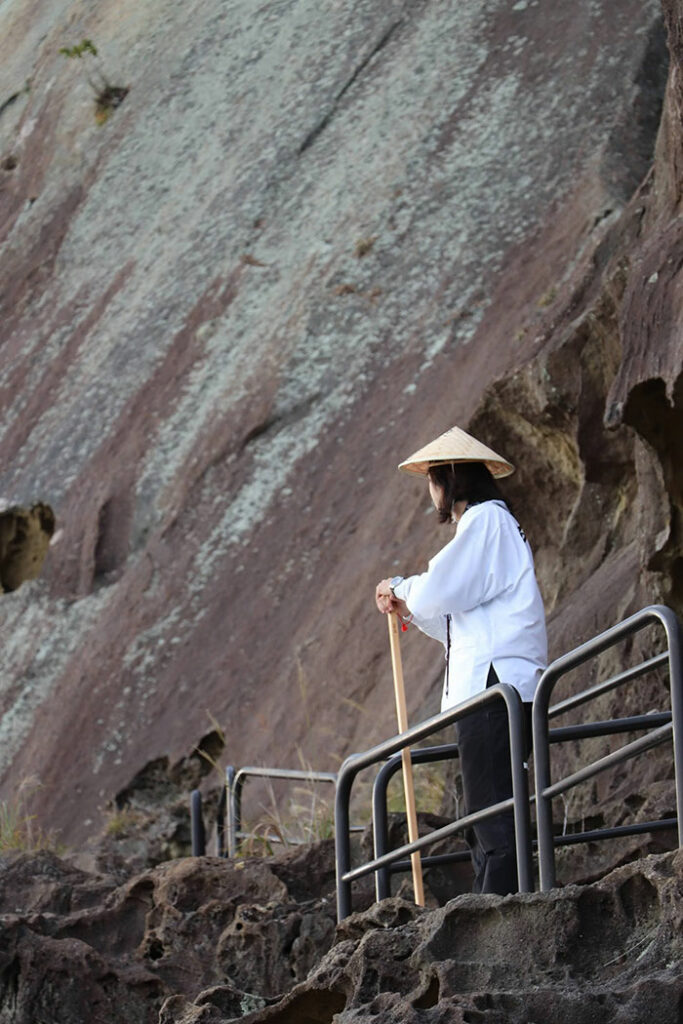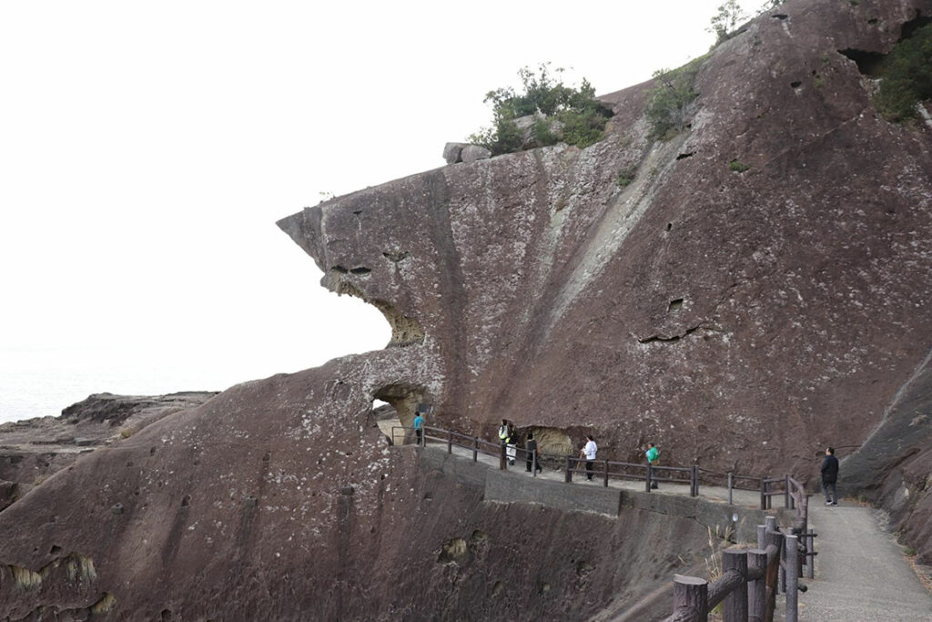遊歩道に足を踏み入れると、まず迎えてくれるのは、巨大な岩壁がつくるアーチだ。海面から吹き上がる湿った風が岩肌の凹凸をなぞるように通り抜け、音色を変えながら反響していく。ここで最初に訪れるのは “閉じ込められる感覚” ではなく、“岩に包まれている感覚”。巡礼者も思わず笠紐を〆なおす。