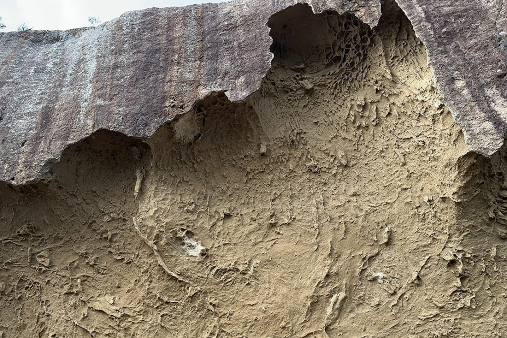 火山から噴き出した火山灰が、地上や水中に堆積して固まってできた岩石。手で触るとぽろぽろと崩れるほど柔らかく、波によって削られやすい性質をもつ。そのため、洞窟やアーチ状の地形が形成されやすいことが特徴だ。
