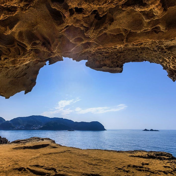 七里御浜の北端に位置する海岸地形の名勝。熊野灘に面した奇岩の迷宮・鬼ヶ城は、数度の大地震による隆起と、熊野灘の荒波が削り続けた凝灰岩(ぎょうかいがん)の大岩壁が約1kmにわたり連なる世界遺産である。洞窟や断崖、海風が織りなす圧倒的な自然景観が魅力だ。