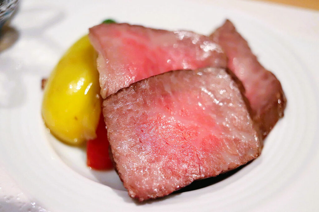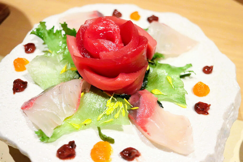 刺身皿の中心には鮪の花が咲く。取り囲む鰤、鯛もなぜ脇役なのかわからないレベルの旨さ。わさび・醤油ではなくソースで食べるのが海華流。松阪牛のローストビーフは肉の旨味が凝縮され美味しさが格別だ。お気に入りはカツオの生節マリネ・・・これは絶品。