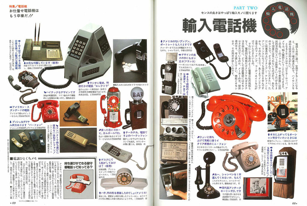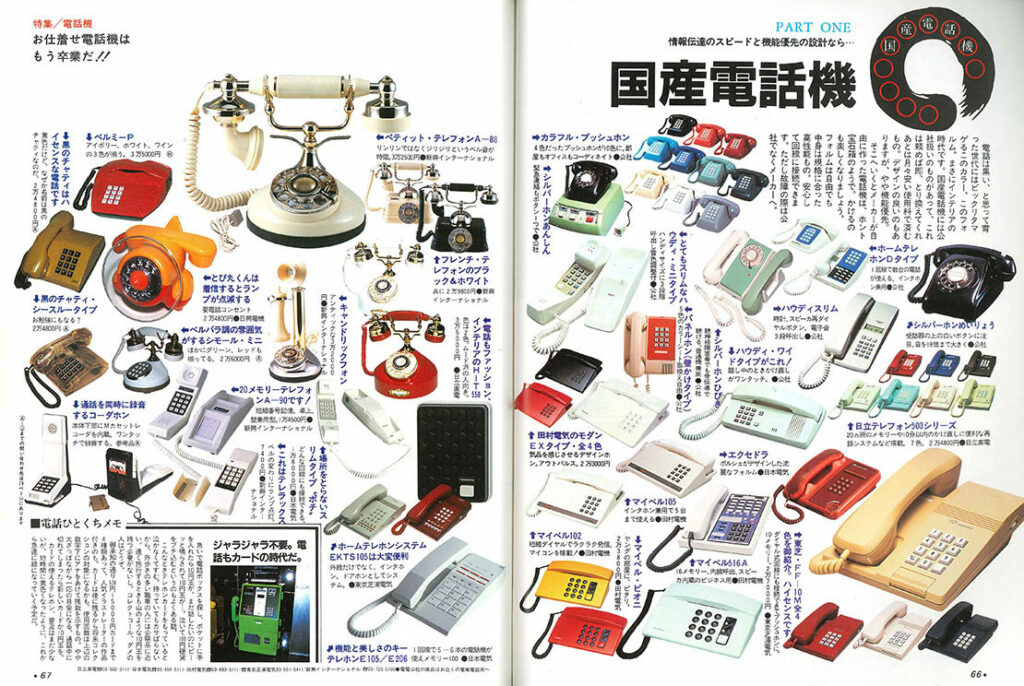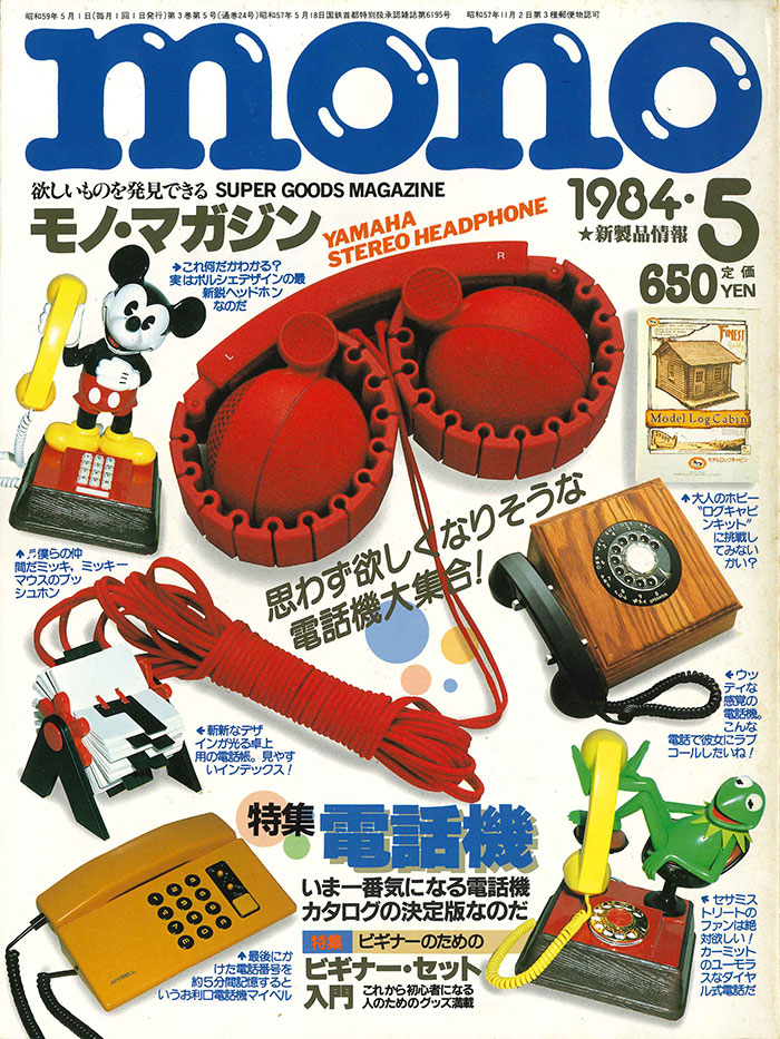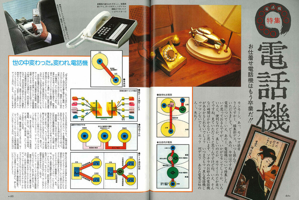 そして、「特集 電話機 お仕着せ電話機はもう卒業だ!!」。カラー16ページ。「モシモーシ。あっ、モノマガ読者さんですかー、編集部デス。いつも読んでいただきまして。どーも。あの、今回はですね、電話について・・・いえ、あのー、電話機について特集したいと思っておるんですが・・・。いかがなモンでしょうか。いろいろと、便利なのとか、美しいのとか、カワイーのとか並べてですね、見ていただこうと思うんですけどね。いえ、そんなに時間はかかんないと思います。ソチラのお好みの電話機があるかもしれないでしょ? いつまでもマッ黒な電話機じゃツマンないでしょ。エッ? 何デス? あなた電電公社の人・・・。失礼!」というリードを読んでいただければ、どんな特集かおわかりいただけるでしょう。