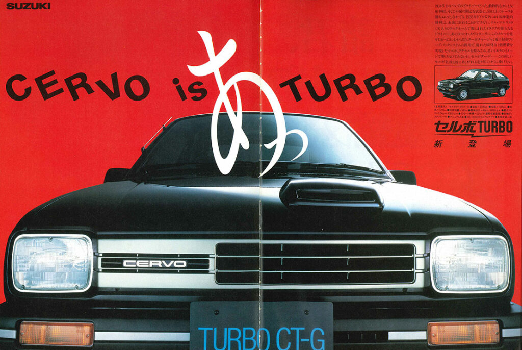 表紙をめくって、ひとつ目の広告はスズキの「セルボTURBO」です。パースがついた正面写真の切り抜きで、赤バック。白抜きの明朝体に長体と斜体をかけて「あ」の字と「っ」の字を重ねてます。実にインパクトのあるレイアウトでねす。