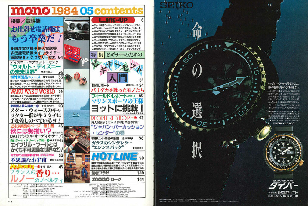目次です。右ページの広告は、服部セイコー(現セイコーグループ)の「SEIKO SPORTS ダイバー」。キャッチコピーは「命の選択」。「いいダイバーズウォッチを選ぶことは、自らの生命を守ることかもしれない」ということなんですね。