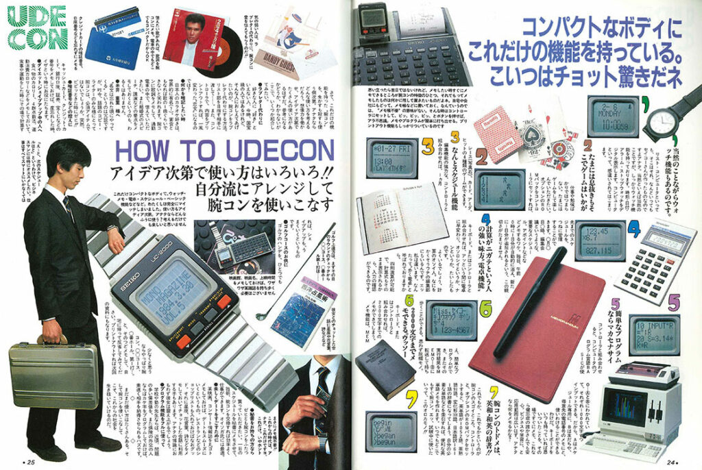 カラー4ページ構成の「ライバルに差をつける “これだけグッズ” メモ不要!! 〈腕コン〉を使いこなせ」では「SEIKOリストコンピュータ UC-2000シリーズ」をじっくり紹介してます。今のスマートウォッチと比較してもしょうがないんだけど、この時代のリストコンピュータにどんな機能があったのか、ちょっと知りたいですよね。誌面より引用しときます。