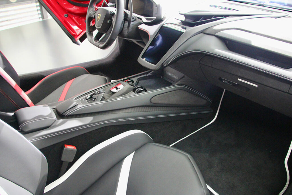センタートンネルは、その分割の軸となり、エクステリアと呼応する縦方向のフェードエフェクトを施したスタート&ストップフラップによって、際立つディテールは、ランボルギーニの熟練した職人技を体現している。