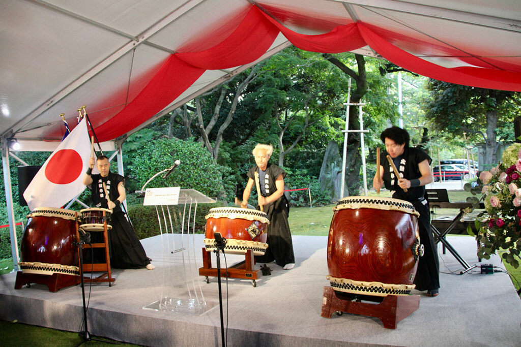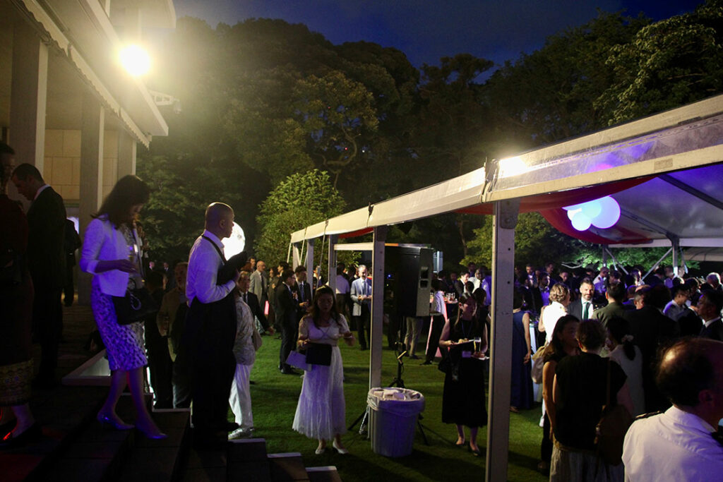 緑の季節に行われた、開放感ある大使館の庭園で行われたガーデンパティーならでは人々が心地良い夏の微風を感じながら、夜遅くまで集い大いに盛り上がった。