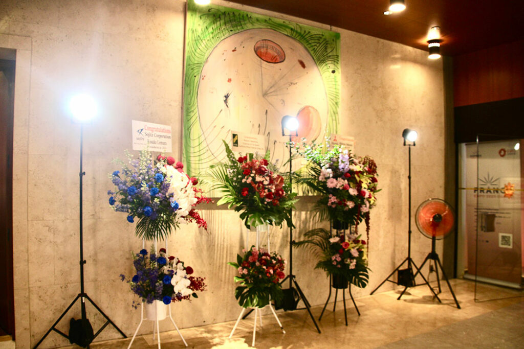 会場には、革命記念日の開催を祝して、多くの祝辞や美しい花束が届き、ホール一面に華々しく飾られていた。