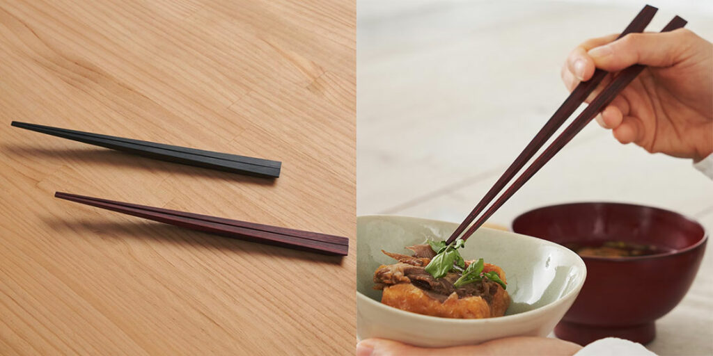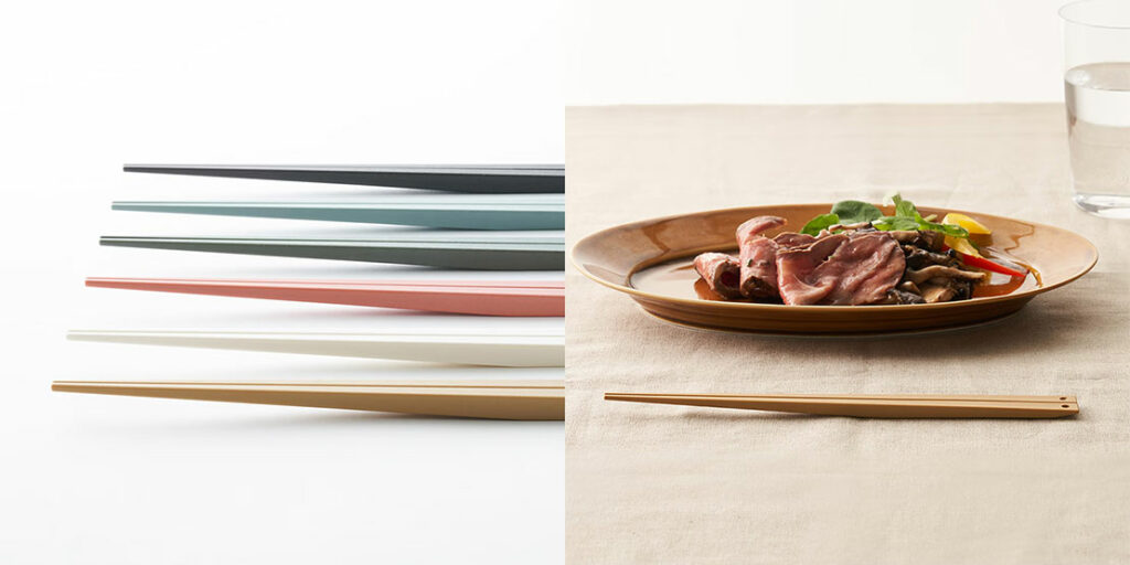 先端が浮き上がっているのでテーブルに触れずに置くことができる箸置きがいらない箸。ポリブチレンテレフタレート樹脂製です。価格1100円