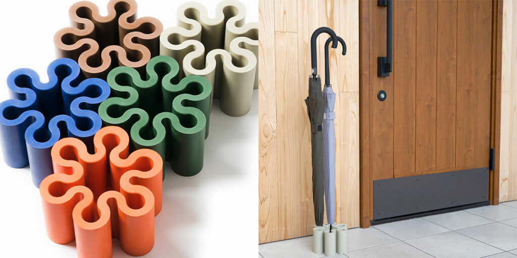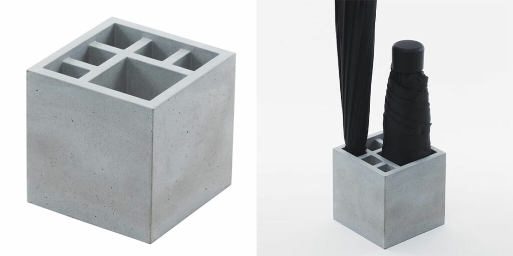 一辺が10cmのコンパクトな立方体で、最大9本収納できる傘立て。モルタル製で、時間がたつと自然に乾燥。価格8800円 ※合成ゴム製(価格5500円)もあります。