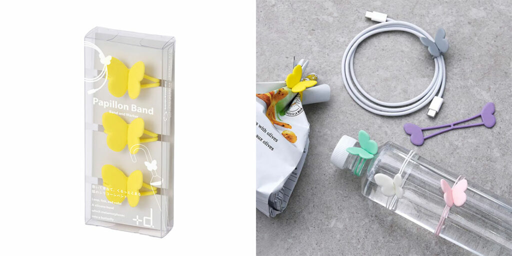 束ねて巻くと、くるっととまって、蝶のかたちが現れるシリコーン製のバンドです。価格1485円