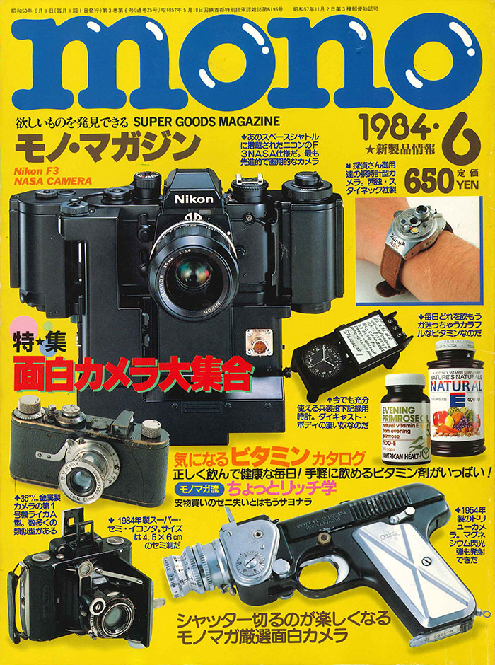 ハイ、これが24号の表紙です。「特集 面白カメラ大集合」にあわせて、変なカメラをたくさん並べてます。いちばん大きく載ってるのは、スペースシャトルに搭載されていたニコンのF3(NASA仕様)。下のピストル型のもカメラなんです。ドリューカメラが警察用に作ったドリュー2で、ピストルの弾と同形の照明弾を6発装填、発射できるんだとか。写真撮りづらそうですけど、どうだったんでしょうか。