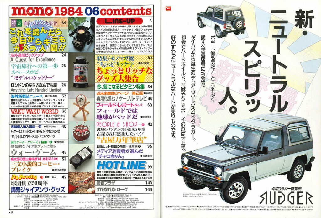 目次です。右ページの広告は、ダイハツの「ラガー」。キャッチコピーは「新・ニュートラルスピリッ人」。ちょっと意味がわからなかったんでAIに訊いてみたら「『新・ニュートラルスピリッ人』とは、特定の思想、感情、状況に偏らず、中立(ニュートラル)な視点を持ちながら、現代のスピリチュアルな感覚や精神的な豊かさを大切にする新しい生き方・在り方を指す言葉として、現代的な文脈で使われ始めています。 」だそうです。そうなのかなぁ・・・。