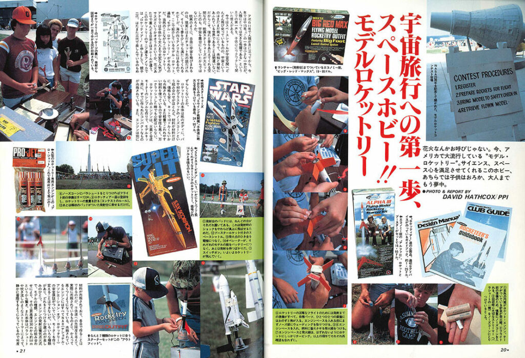 カラー3ページ構成の「宇宙旅行への第一歩、スペースホビー!! モデルロケットリー」では、当時アメリカで大流行していた「モデルロケットリー」を紹介してます。「このロケットリーのマニア達をアメリカでは “ロケッティアー” と申しまして、親子二代、はたまた三代で楽しんでいるのもめずらしくないとか」ってことで、ずいぶん流行ってたようです。火薬でズドンと打ち上げて、パラシュートで静かに着陸。繰り返し飛ばせたようです。