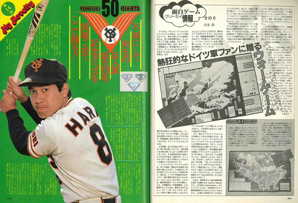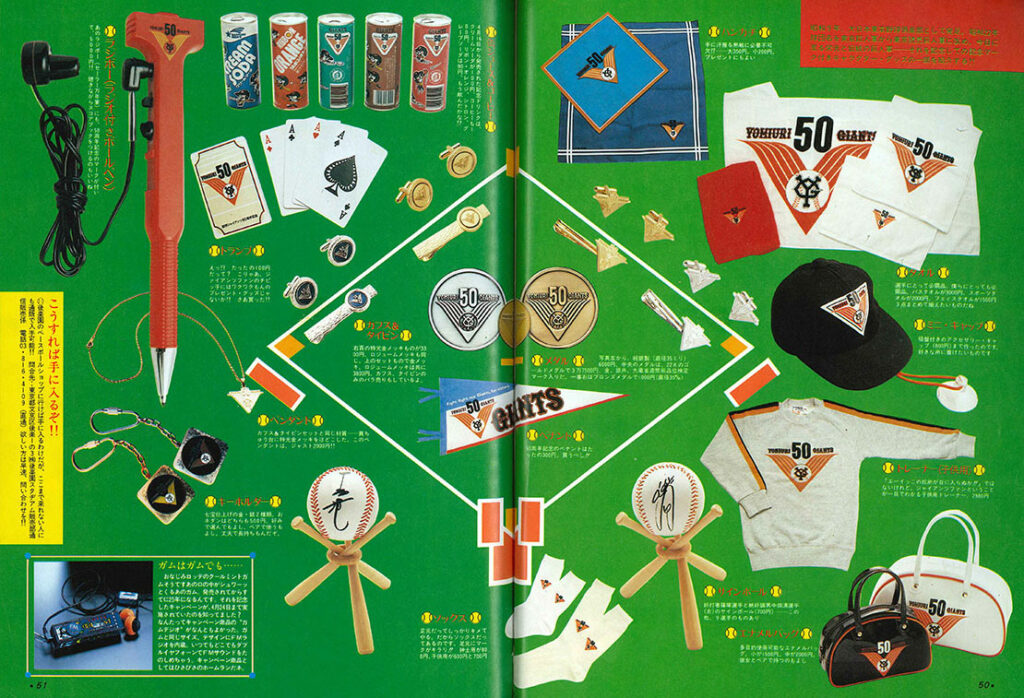 「My Novelty」はカラー3ページ構成。今回は当時創立50年を迎えた「巨人軍」の創立50年記念グッズ。王監督の時代ですね。ドーンと切り抜きで載っているのは通算17年の歴代最長監督を務めた原辰徳さん。好打者篠塚選手と絶好調男中畑選手のサインボールも載ってます。なつかしいなぁ。