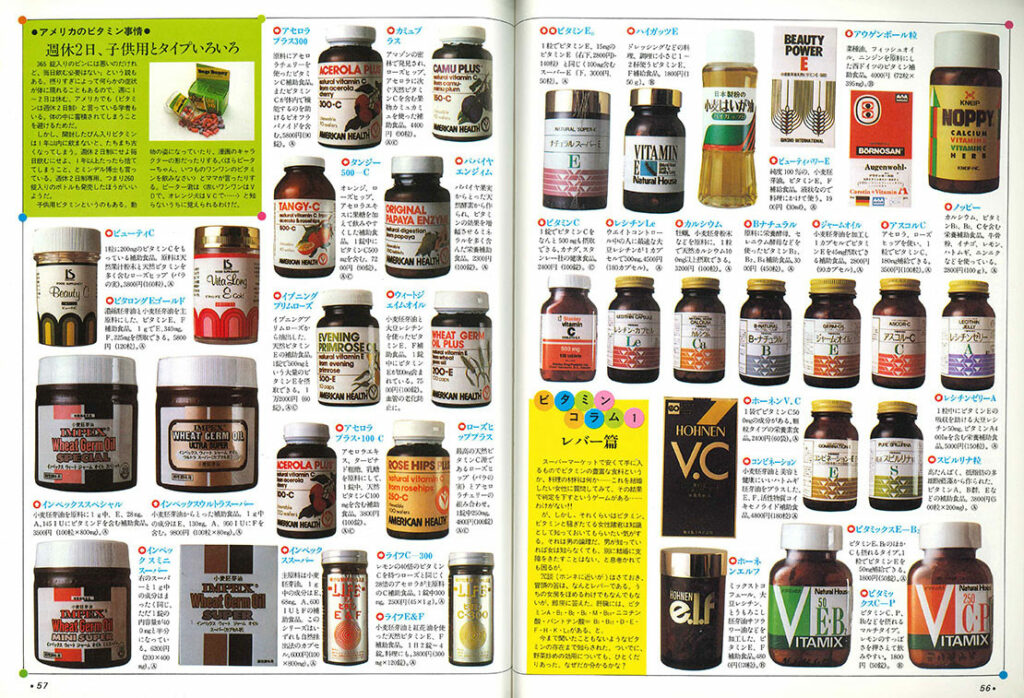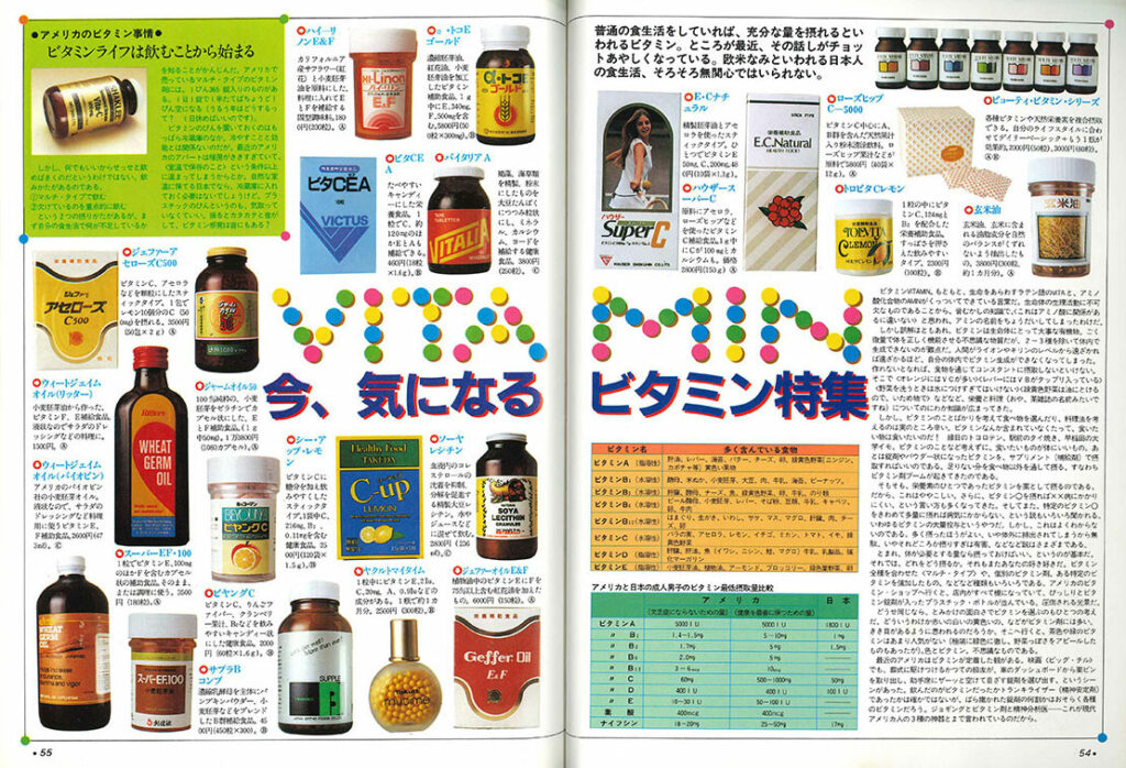 「今、気になるビタミン特集」は、カラー6ページ構成。今となっては、もうとにかくいろんなサプリメントがあるんですが、昔はまずはビタミンでした。