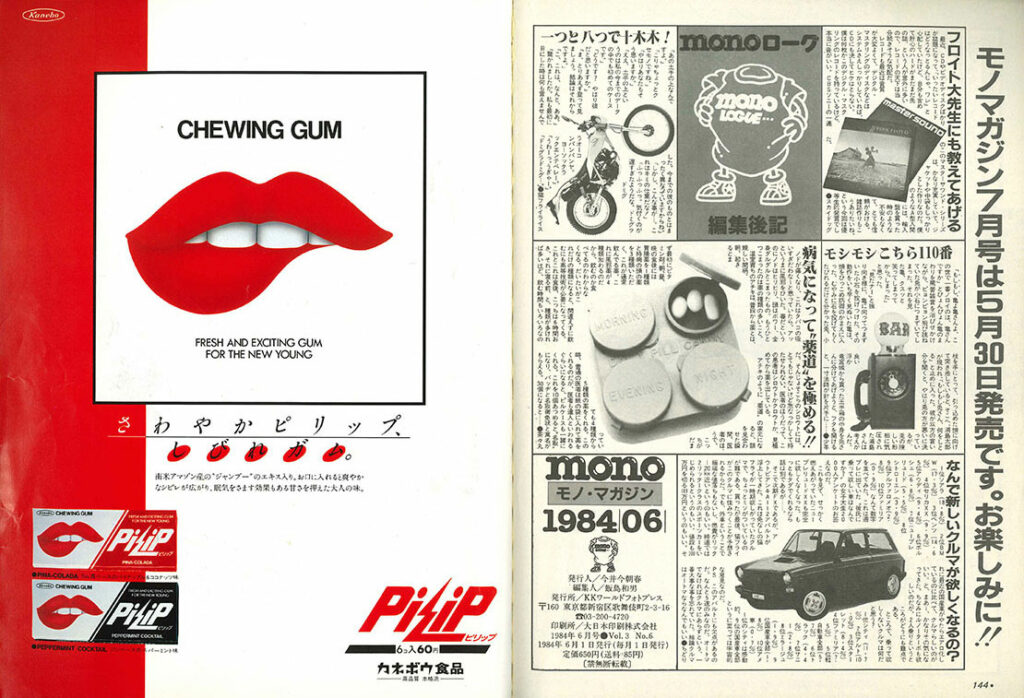 表3はカネボウ食品の「ピリップ」の広告です。コピーは「さわやかピリップ、しびれガム。」。この「しびれガム」という表現が、今となっては妙なおかしさがあります。下唇を噛んでるイラストでしびれ具合を表現してるんでしょうか。そのしびれの元は南米アマゾン産のキク科のハーブ「ジャンブー」。ラム酒ベースのパイナップル&ココナッツ味とジンベースのペパーミント味がある大人のガムですね。