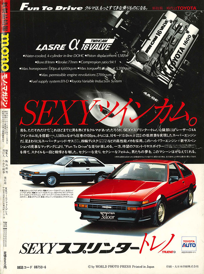 表4の広告はトヨタの「スプリンタートレノ」です。コピーは「SEXYツインカム。」。現在こんなに薄くって角っぽいクルマは日本じゃ作られてませんから、そういう意味では結構セクシーに見えてきました。