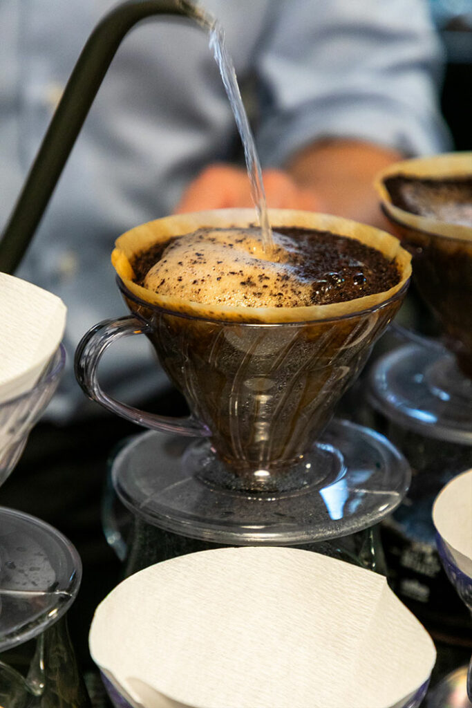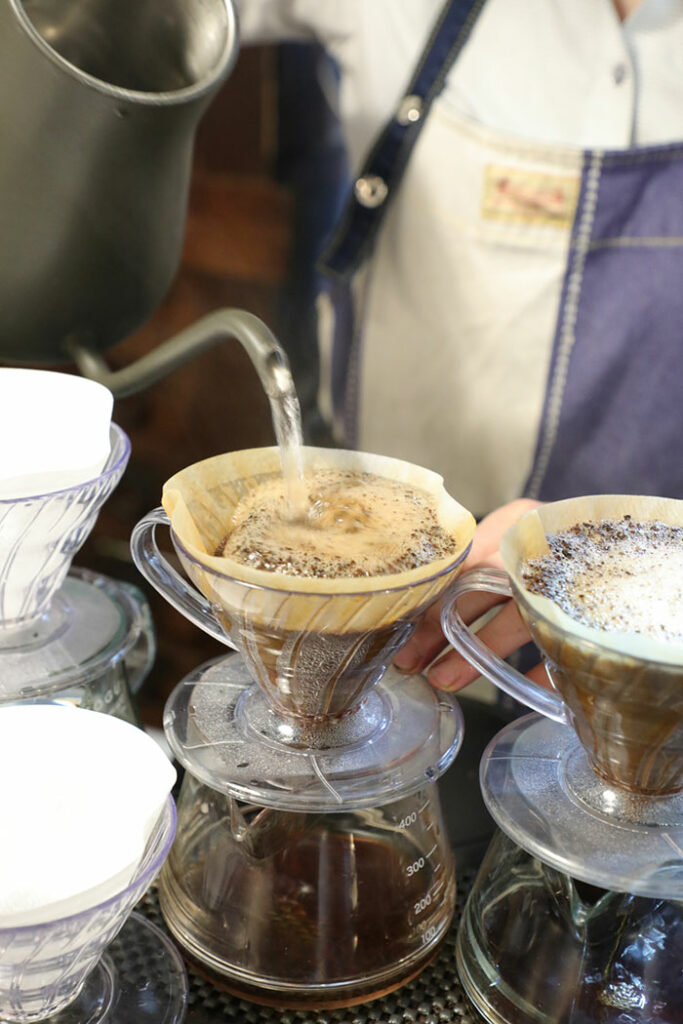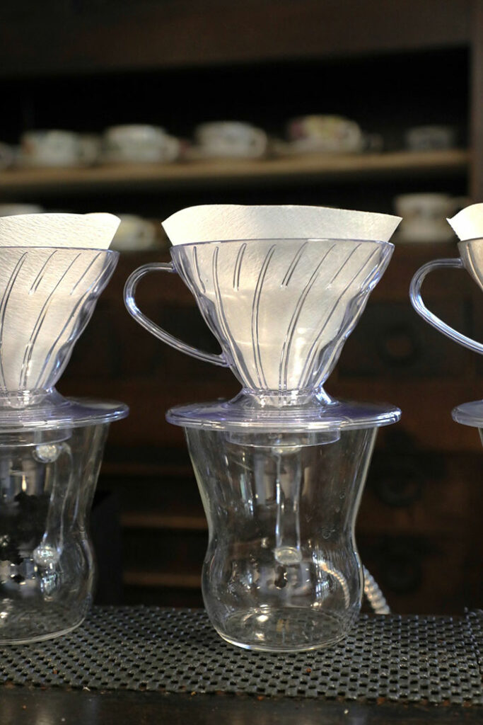 「Kanda Coffee」はコーヒーをペーパードリップで淹れる。ハリオのドリッパー「V60」を使用する。形は円錐形で大きなひとつ穴。ドリッパー内部のリブ(凹凸)はスパイラル形状で高く上部まであり、「渦巻き状に流れるのが特長で、使っている店は多いです」と石毛さん。ペーパーフィルターとドリッパーの間に空間ができ、蒸らしでコーヒー粉を適度に膨張させ、コーヒーの美味しさを最大限に引き出すと言われる。