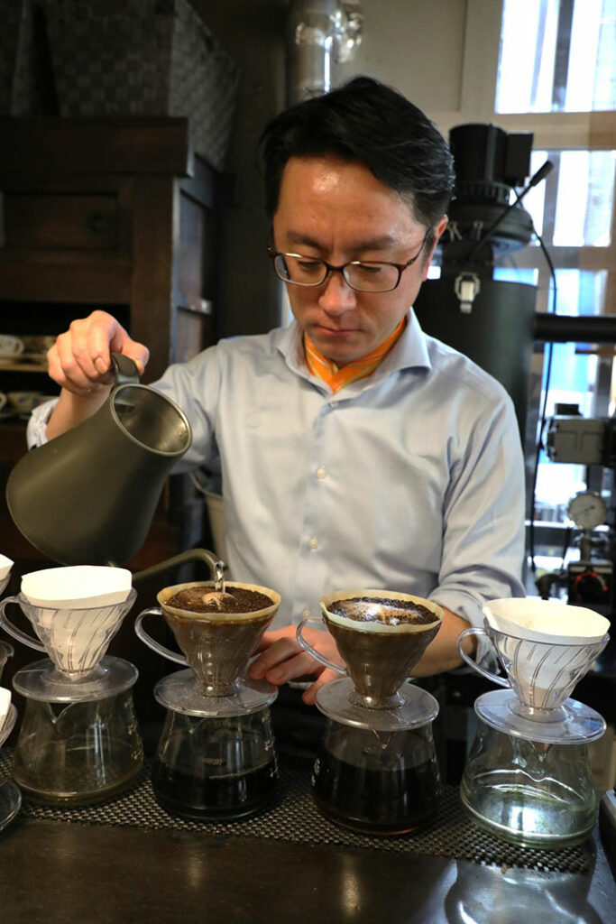 店内で飲むお客、テイクアウトのお客に加えて、オフィス街のためデリバリーの注文も多く、藤原さんはいくつものドリッパーとサーバーを並べ、鮮やかな手つきでポットを操って湯を注いでコーヒーを仕上げていく。小気味よい仕事ぶりだ。