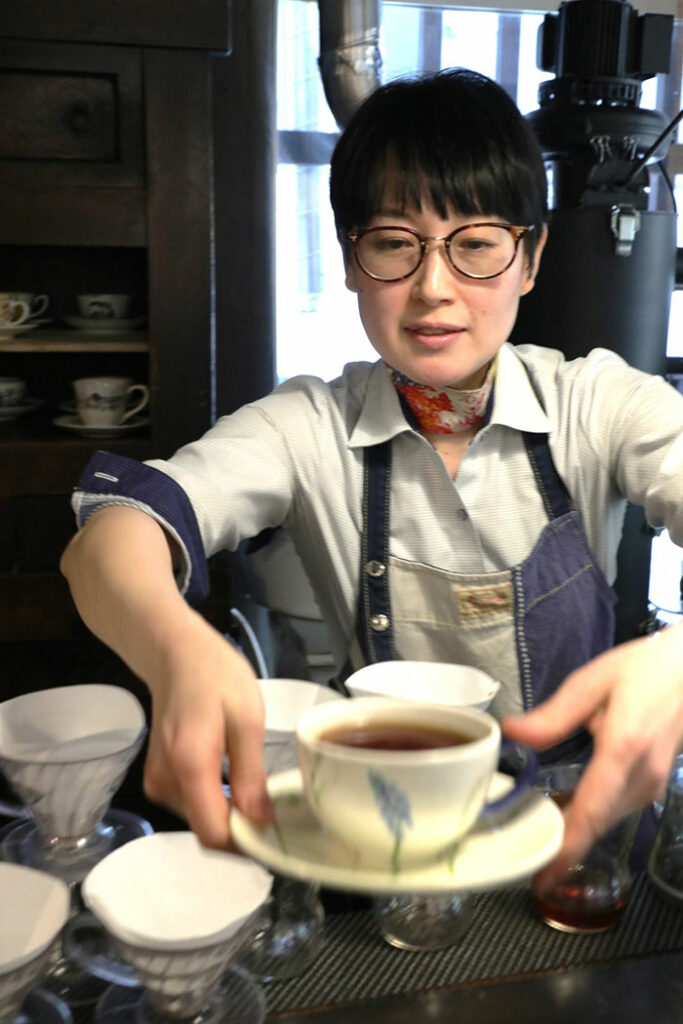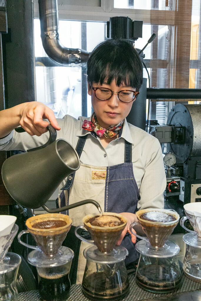 店の看板スタッフは、キャリア10年の藤原さん。この店に入ってコーヒーのおいしさ、奥の深さを知った。「コーヒーは同じ豆でも淹れ方で味が違うし、浅煎り、中煎り、深煎りでも全く違う。すべて当たり前なんですが、最初は驚きでした。いまではお客様に好みを聞いて、おすすめのコーヒーを提供するのが楽しいんです」。