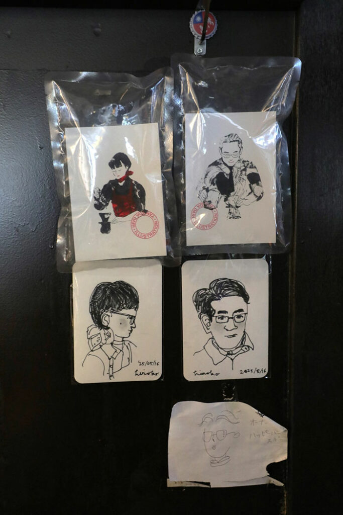 常連さんが描いた石毛店長と藤原さんのイラストが、カウンターの中に貼られている。お客さんに愛される店の証。「いろいろな方が描いた自分を並べた『石毛展』を店の壁でやったこともあります(笑)」と石毛さん。