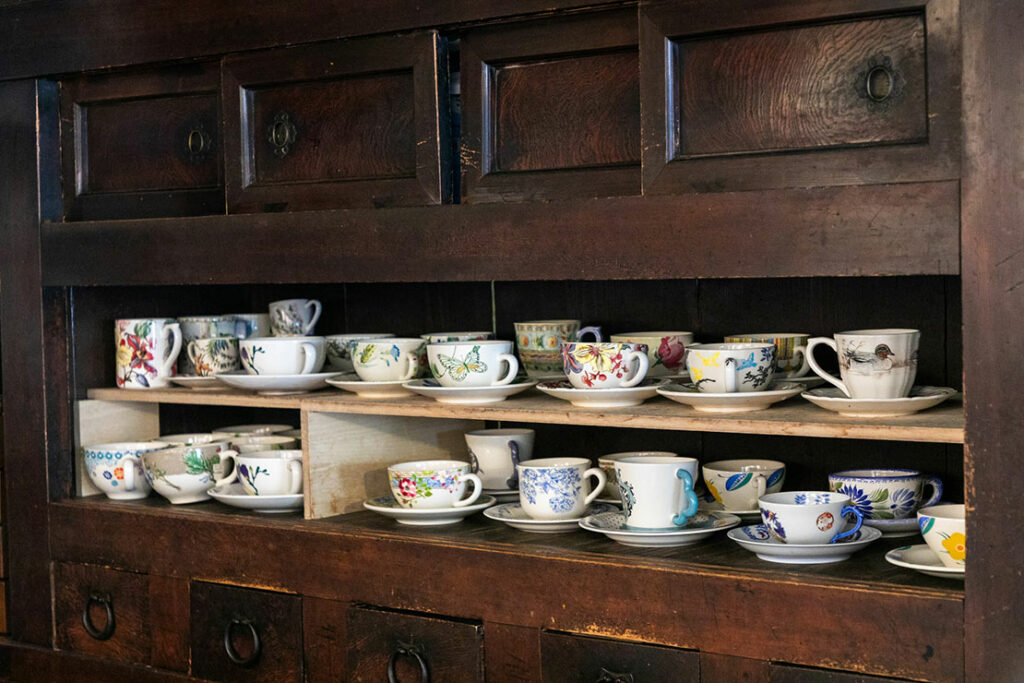 店内のカップはフランスの陶器ブランド「ジアン」のもの。石毛さんがひと目ぼれしたコレクションを使用している。本国からスタッフが店を視察に来たほどの充実度。また、カップを並べた水屋もアンティークでこだわりの品。