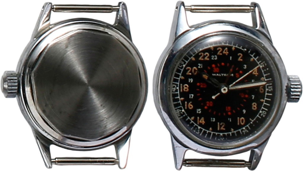 MIL-W-6433に準じたウオルサムのナビゲーション・ウオッチ、タイプA-17。ニッケルプレートでピッチ数の多いねじ込み式の裏ぶたを備える。非防水。裏ぶたの内側にケースメーカーのスター・ウオッチ・ケース社の刻印が入る。