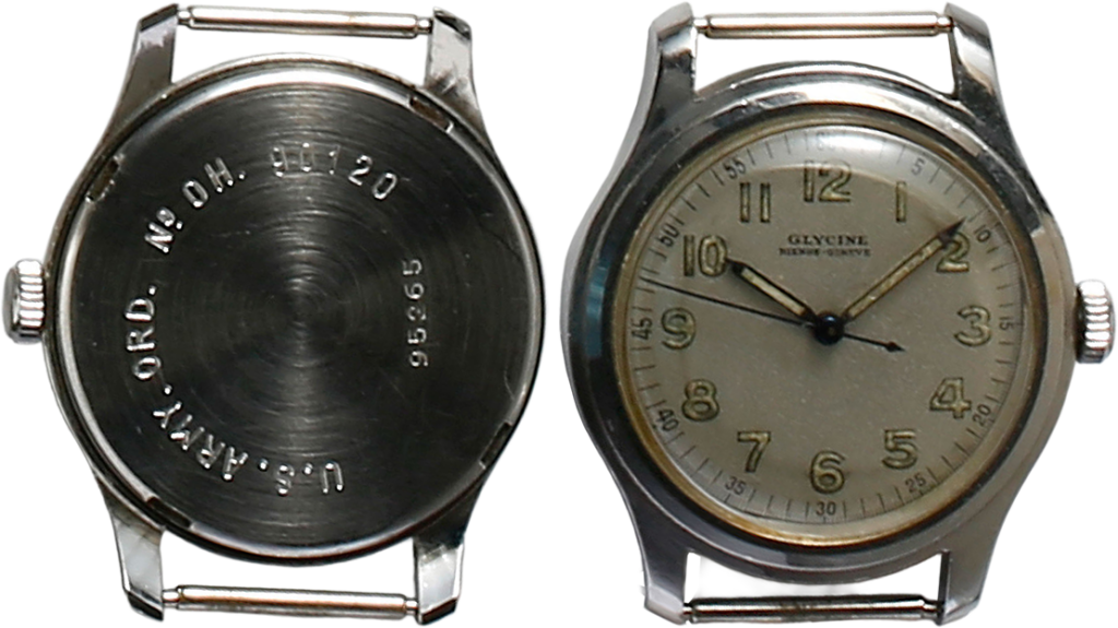 WWⅡで、ドイツやイギリスのミリタリーウオッチを多く生産していたグリシンのドイツ陸軍用。時計不足の米軍がグリシンにあったドイツ軍の時計を接収してOHの刻印でアメリカ軍のものとした。