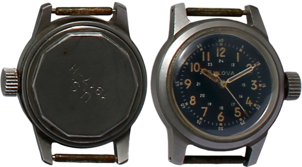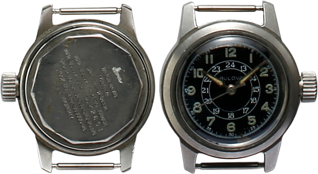MIL-W-3818Aによって生産されたブローバの軍用時計。このスペックは、途中で改定され、スモールセコンドから中央3針になった。裏ぶたにはミルスペックが細かく入っている。24時間表示と赤い中央秒針を持つ。