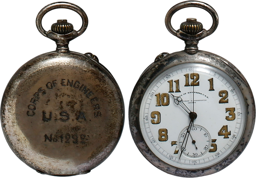 スイスの一流メーカーがアメリカの工兵部隊からの発注を受け製作。精度の高いポケットウオッチ。CORPS OF ENGINEERSはアメリカ陸軍工兵隊を示す。大きな刻印が印象的である。