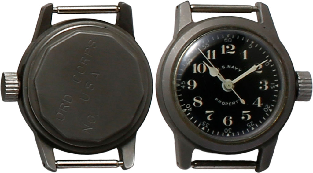 非常に珍しい文字盤といわれているエルジン製。文字盤に「米海軍所有」と記される。メーカー名は入っていない。裏ぶたには刻印が入っている。ただし、シリアルナンバー等が入っていないのはテストサンプルの可能性がある。