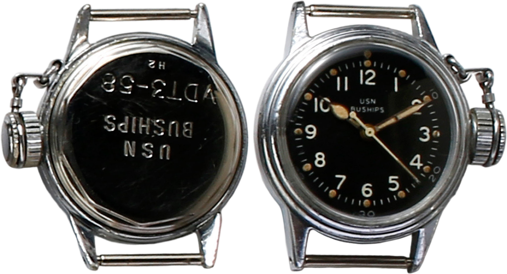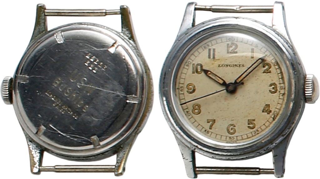 ロンジン。米海軍のオーダーにより製造した17石のムーブメント搭載。刻印のU.S.N BUSHIPSはビューロー・オブ・シップス(艦船局)を意味する。海軍用はUSN、海兵隊用はUSMCの刻印。